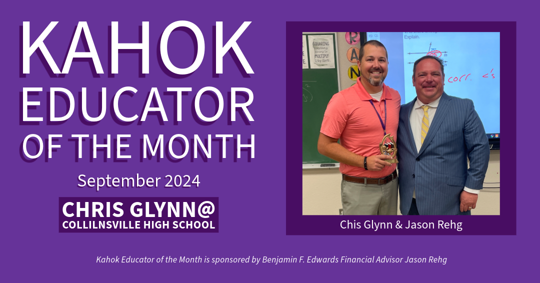 Collinsville High School math teacher Chris Glynn was recognized today as September 2024 Kahok Educator of the Month. The award was presented by CHS Principal Dr. Daniel Toberman and local Benjamin F. Edwards financial advisor Jason Rehg.