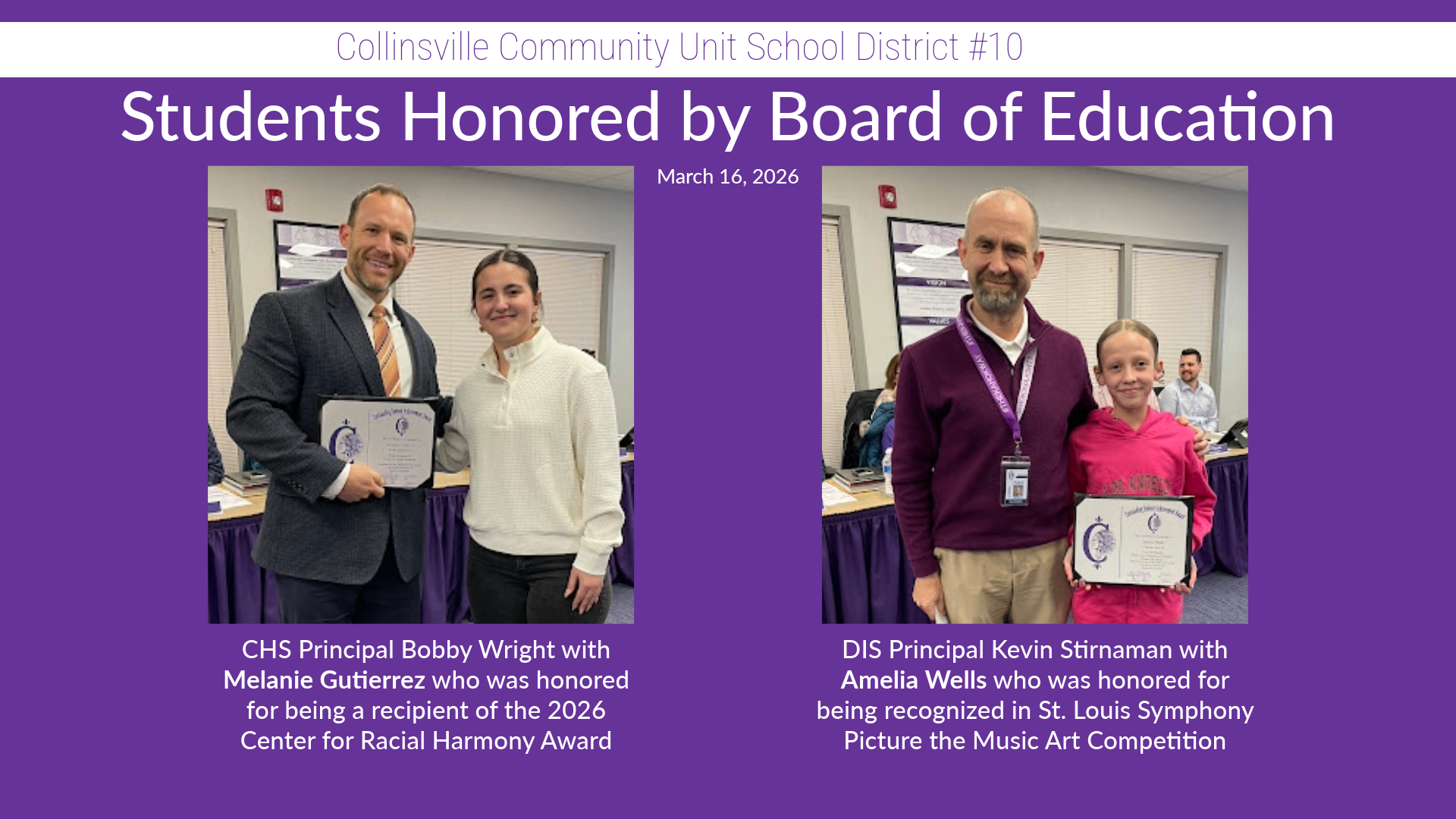 The CUSD 10 Board of Education honored two students during the March 2026 regular meeting: Collinsville High School senior Melanie Gutierrez and Dorris Intermediate School student Amelia Wells. Mel...