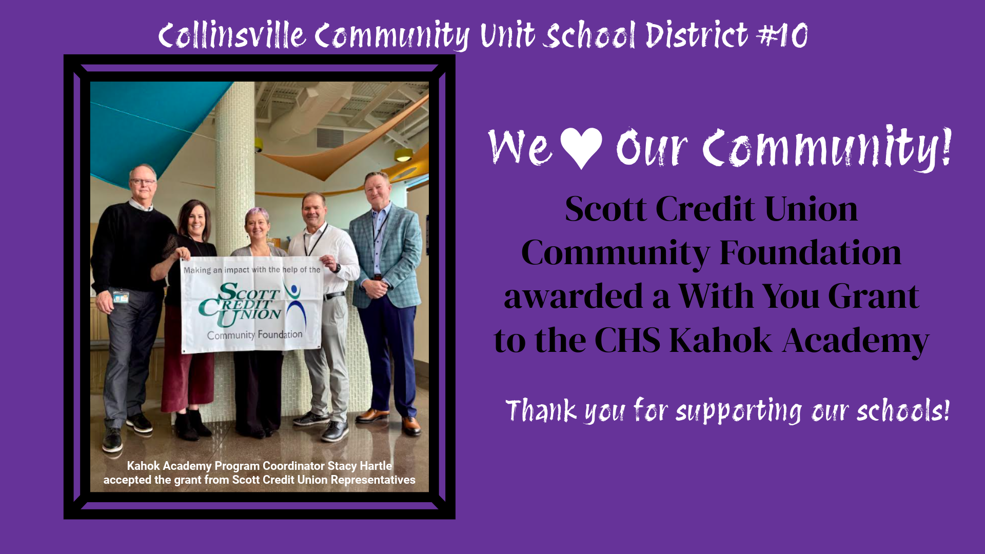 Kahok Academy was awarded a grant from the Scott Credit Union Community Foundation. The grant will help provide incentives to reward students in the CHS Kahok Academy credit recovery program. Sta...
