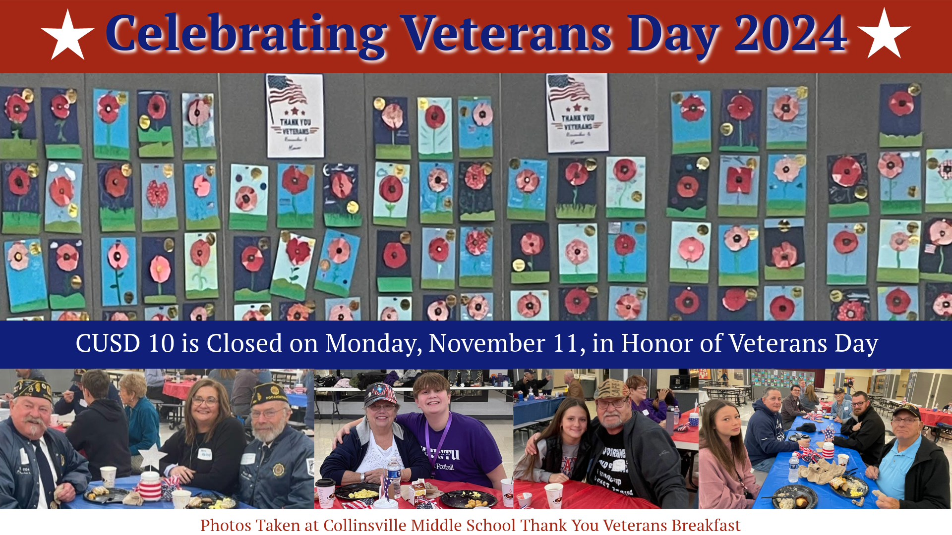 Collinsville Community Unit School District #10 administrative offices and schools are closed on Monday, November 11, 2024 in observance of Veterans Day.
