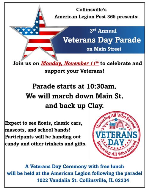 We encourage everyone to use this day to honor and thank the many Veterans and active service military personnel in our community. Here is information about the Veterans Day Parade presented by Collinsville's American Legion Post #365: